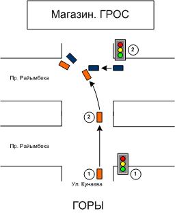 2. Нахожусь посредине пр. Райымбека светофор начинает мигать, продолжаю движение. Замечаю, что с правого ряда по Райымбека начинает движение Мерседес. Начинаю подавать звуковые и световые сигналы, давлю педаль тормоза в пол, руль влево – начинаю уходить от удара.